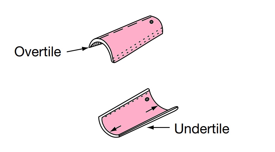 - The undertile is positioned with its concave side facing upward and its longer end toward the ridge, while the overtile is placed convex-side-up, overlapping the edges of the tiles below.