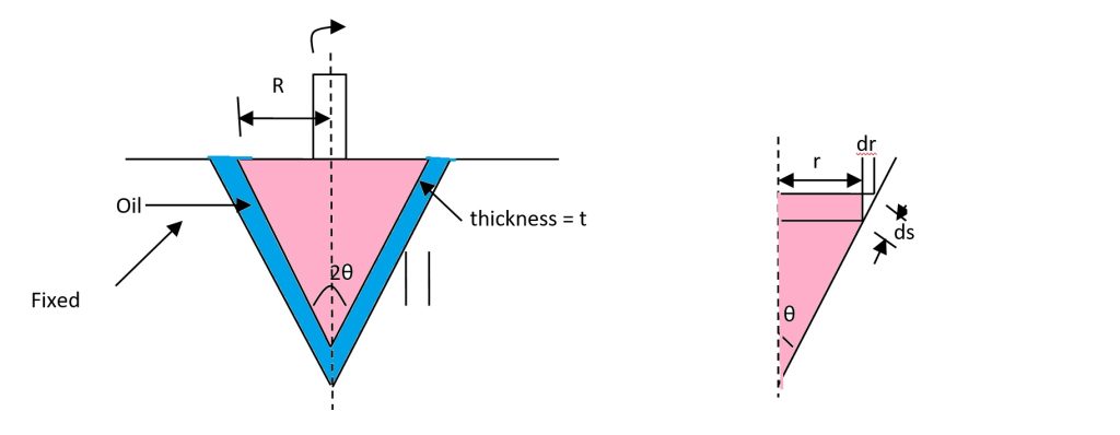- Shear stress and velocity gradient: The torque required to rotate the cone depends on the shear stress exerted by the oil layer, which is proportional to the velocity gradient (\( u/t \)) and the viscosity (\( \mu \)).